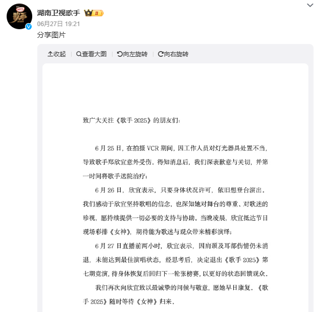 本期芒果官宣了两位补位歌手,没想到在直播前,补位的郑欣宜因为拍摄VCR期间不幸受伤,退出了比赛。